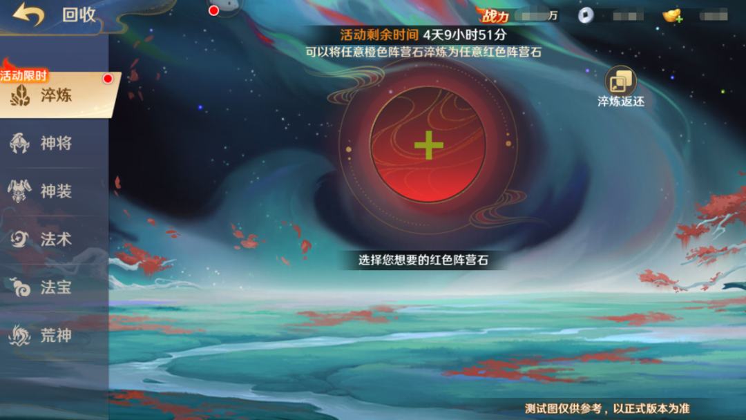 *已淬炼的红色阵营石返还为橙色阵营石时,可自行选择想要退还的数量和橙色阵营石的种类,不用强制退回所有淬炼过的阵营石。