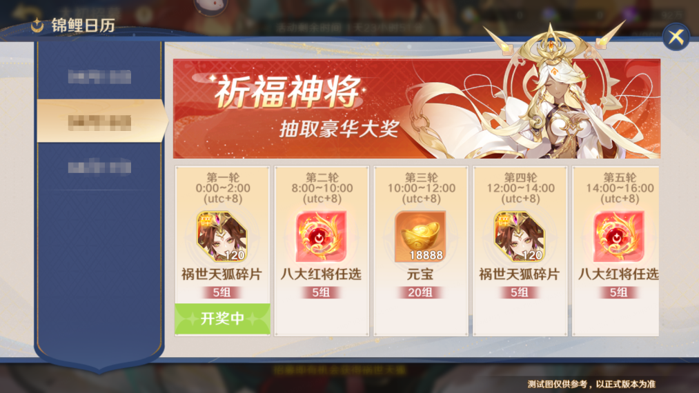 5、锦鲤大奖包括祸世天狐碎片*120、八大红将任选、元宝*18888、橙色荒神任选箱等奖励!
