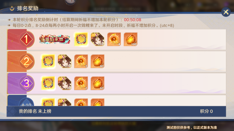 1、活动期间每日0:00-2:00、8:00-24:00,每2小时开启一次积分排名;