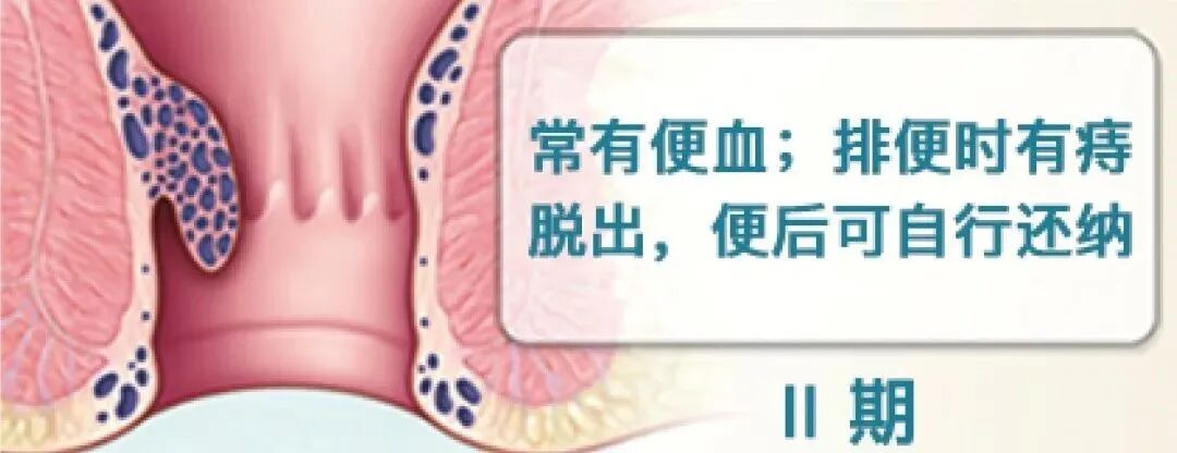 2度——常有便血;排便时有痔脱出,便后可自行还纳。