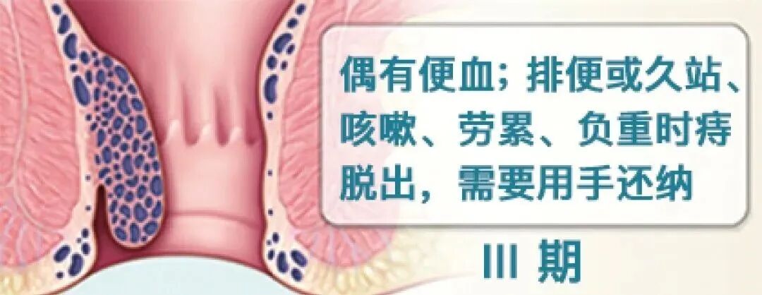 3度——偶有便血;排便或久站、咳嗽、劳累、负重时痔脱出,需要用手还纳。