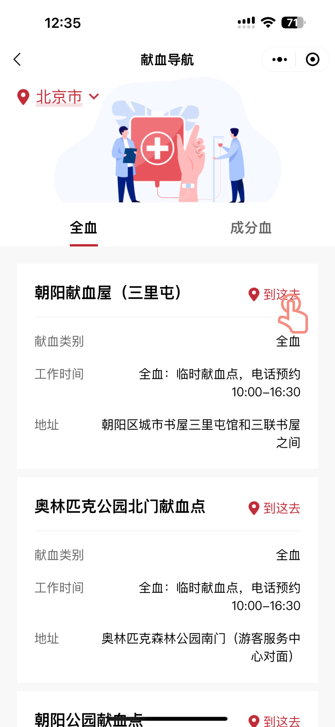 如果你想献血,可通过“献血导航”功能自动匹配附近的无偿献血站点,点击“到这去”还可查看站点位置。