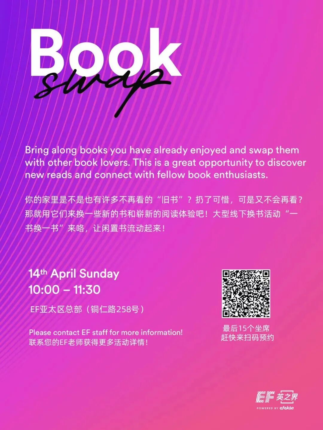 在过去一年,EF也曾举办两次相同的活动,都受到了参与者的好评,当时仅对学员开放,很多粉丝看到后也都希望能参与其中。所以,这一次我们将邀请更多爱书之人加入我们的换书行动,非EF学员也能报名哦!