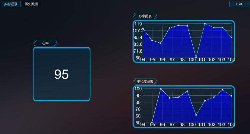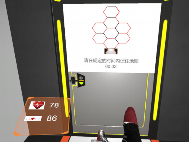 系统基于VR场景对注意力、记忆力、空间定向能力等3项认知能力进行测评及训练,支持任务难度选择,同时获取被测者实时心率,数值通过软件界面呈现。利用虚拟现实的三维场景,结合生理传感器对被测者进行情绪和认知能力的恢复训练工作;系统运行过程中,实时呈现受训者的情绪状态,治疗结束后,即时呈现受训者的注意力、记忆力、空间认知能力的被测数据,包括三个用于对训练者进行应激表现评估和应激恢复工作的心理能力评测任务,全面展示训练效果。