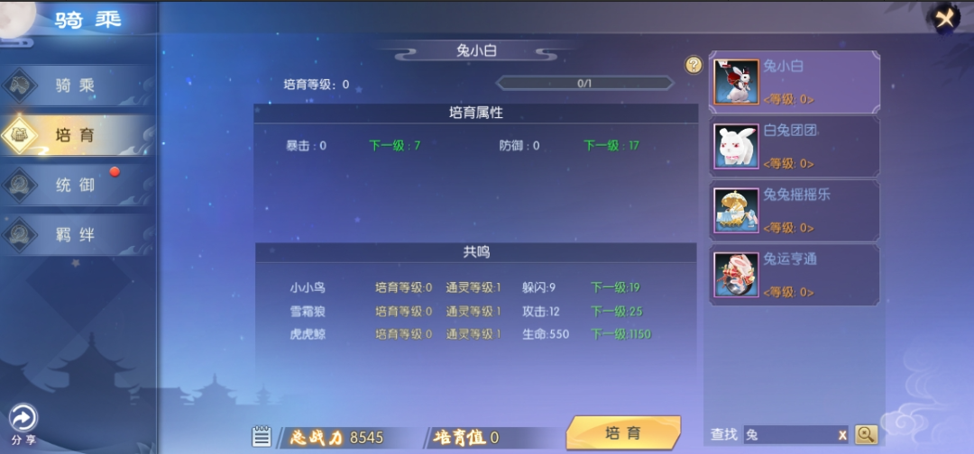 可快速定位坐骑进行培育。