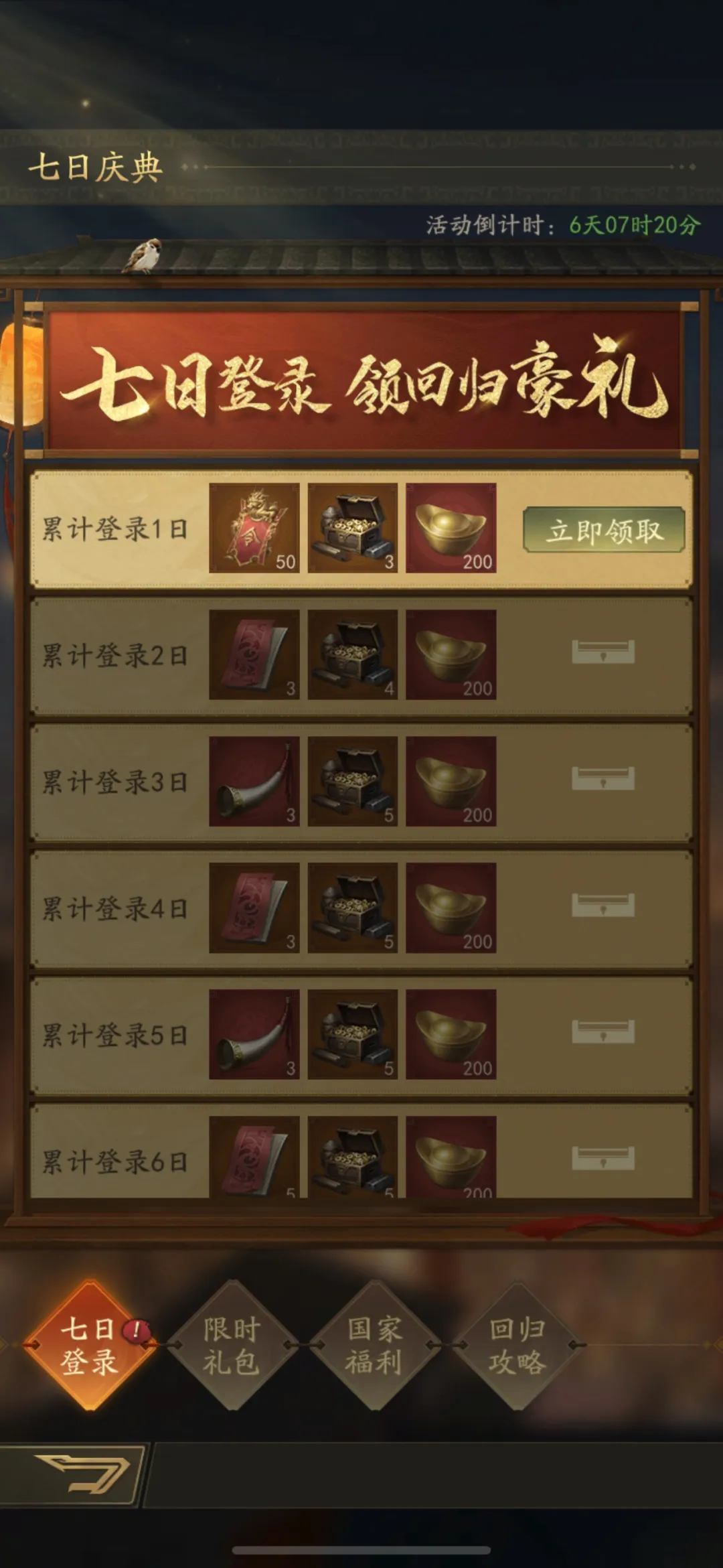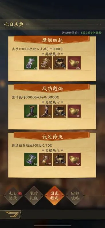 七日登录奖励、国家福利奖励,