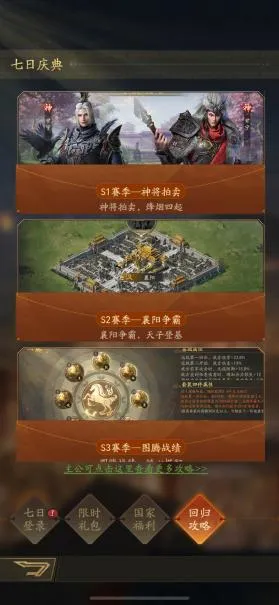 对于不同赛季的回归主公,我们还准备了各个赛季的专属攻略供您查阅,愿主公的霸业征程战无不胜,剑指天下!