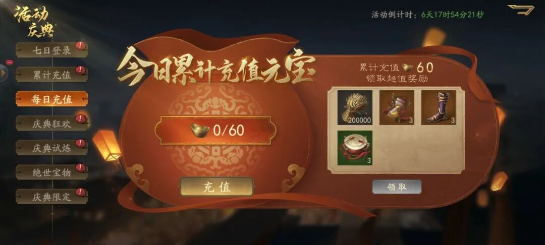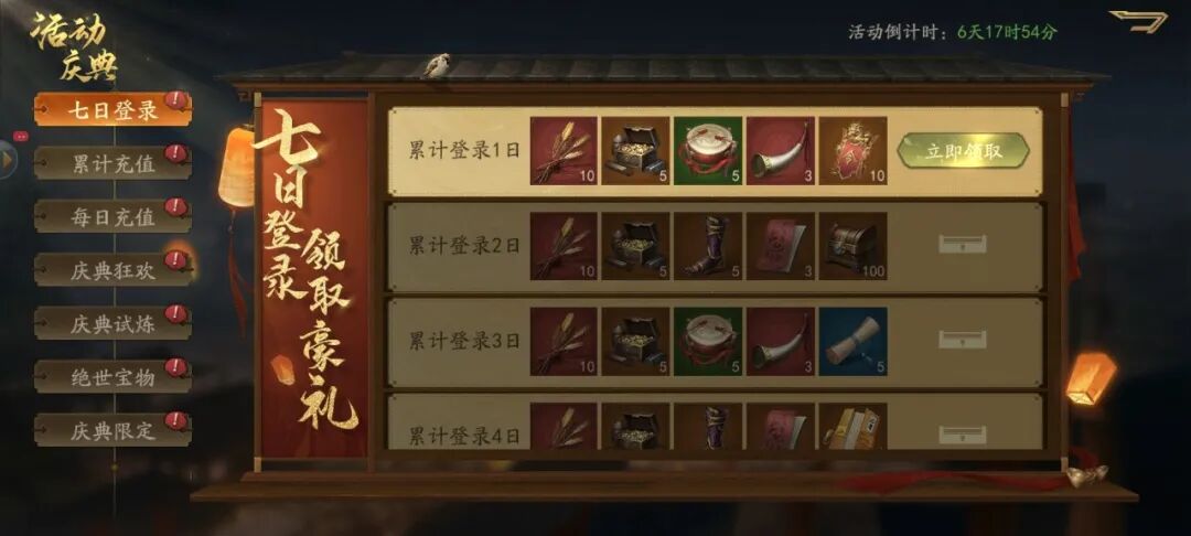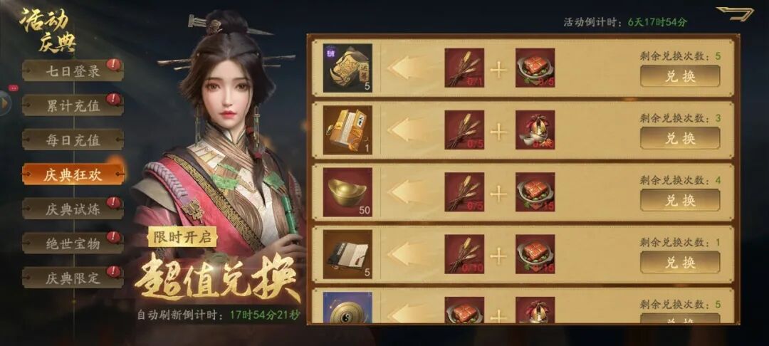 完成庆典试炼与登录活动,获得庆典活动道具,兑换游戏内重要物资!