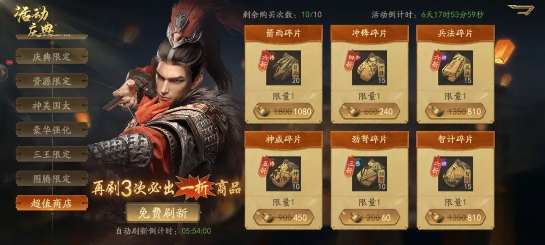 在庆典活动期间,处于S3及以上赛季的主公将可购买获得吴国太英雄碎片与觉醒道具。