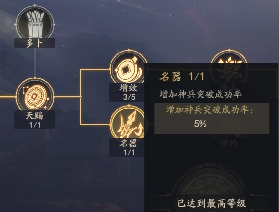 藏兵阁的武器不会重复出现,所以一直打造到出现鸣鸿刀为止,然后突破材料后面就给鸣鸿刀做突破,有的小伙伴担心突破概率太低,记得一定要在观星台点上“名器”,再去突破。