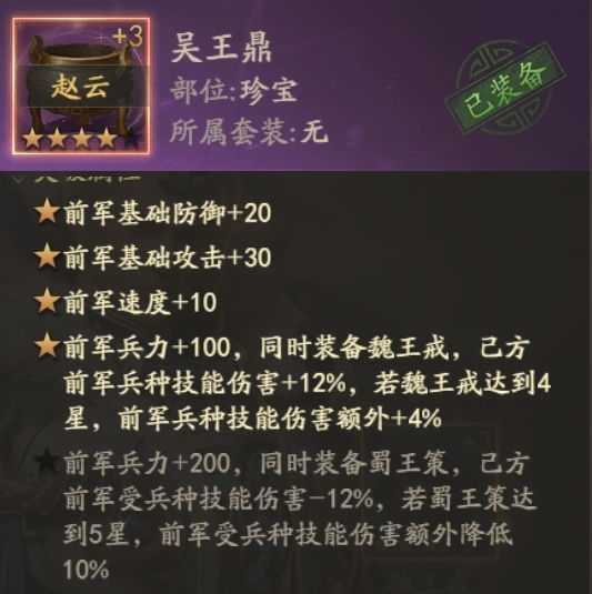 吴王鼎加的是前军属性,也就是赵云的步兵属性,这个很重要,赵云能扛到技能触发,和谁都是五五开,如果考虑到四维不够,需要加四维,则考虑带幽谷香炉。