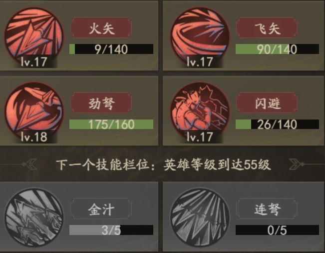 15级学习第三个弓兵技,35级学习第四个弓兵技,55级学习第五个弓兵技。