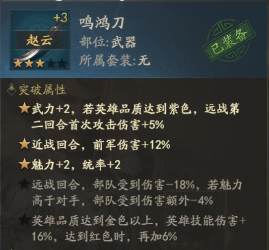 鸣鸿刀给武力+魅力+统帅,同时还有减伤和增伤,搭配上赵云技能,肯定是零氪赵云的不二之选,打造出来以后,屯好材料猛猛突破就完事。