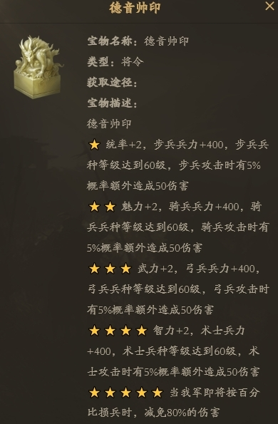 德音帅印为平民玩家必须考虑的宝物,能够提升兵力和四维的同时,也能提供高额的减伤,这样就能提高赵云的存活时间。