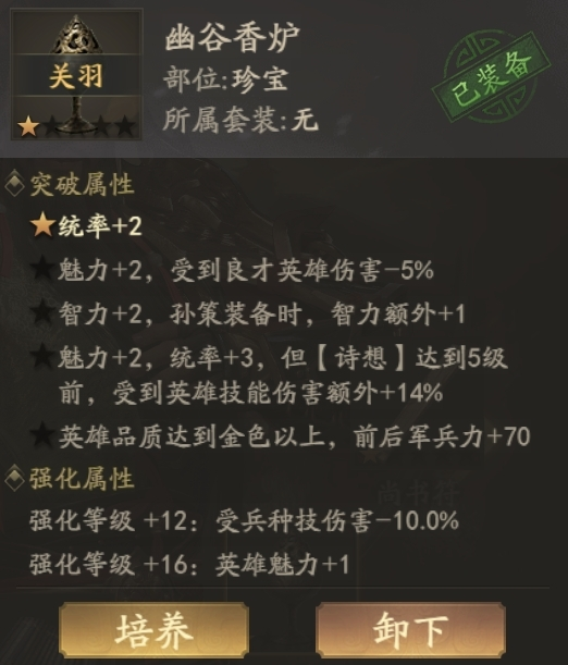 幽谷香炉给了非常多的四维属性,想提高赵云四维的就可以替换吴王鼎,主要还是看需要哪个维度,需要前军属性则考虑带吴王鼎,需要提高四维则考虑带幽谷香炉。