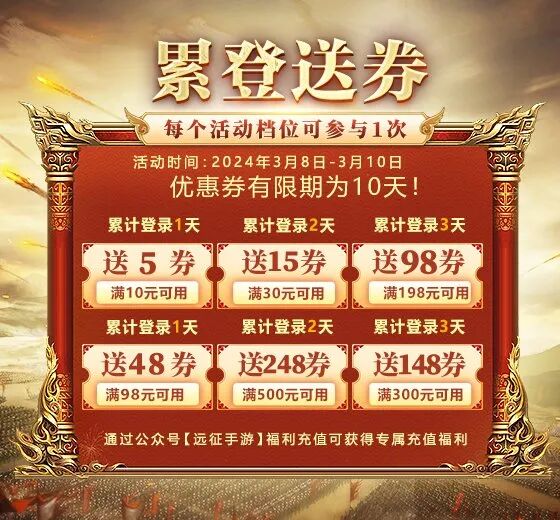 4、充值优惠券将在达成档次的第二天直接发送到角色上,在公众号充值或者游戏内点击充值可直接使用充值优惠券!充值优惠券有效期为15天。