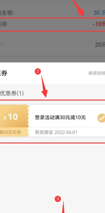 ③点击优惠券栏,选择需要使用的优惠券,点击确定,即可在付款时自动减免优惠券金额~