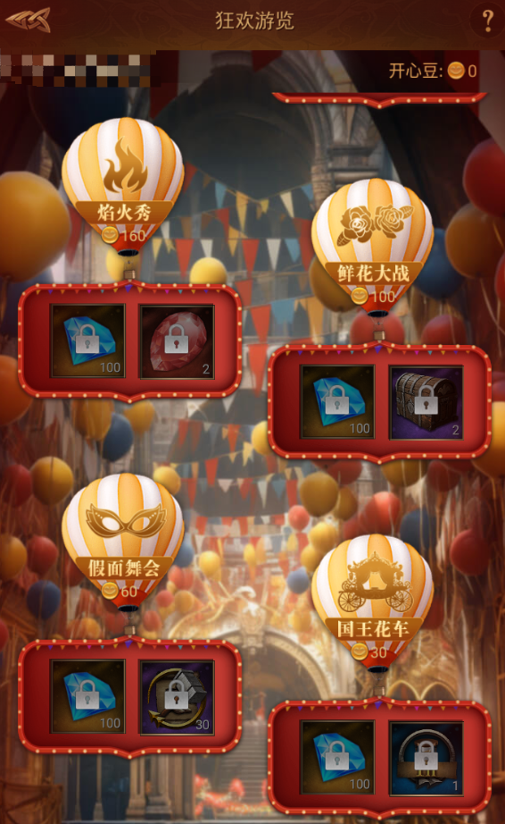 购买狂欢门票后可参与狂欢游览,可通过做日常任务获取开心豆,达到对应数量可获得对应奖励