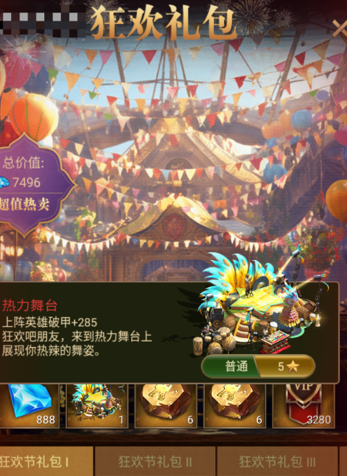 活动期间,购买狂欢节礼包可获得限定主城皮肤、传奇升星石、钻石、加速卡、资源箱等超值奖励