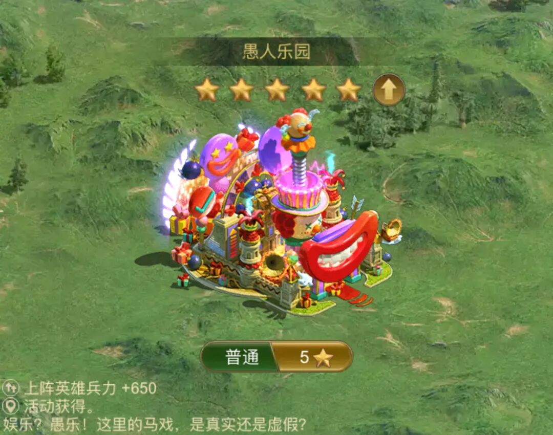 本次愚人节活动为大家带来节日限定主城皮肤【愚人乐园】,五星状态下上阵英雄兵力+650!