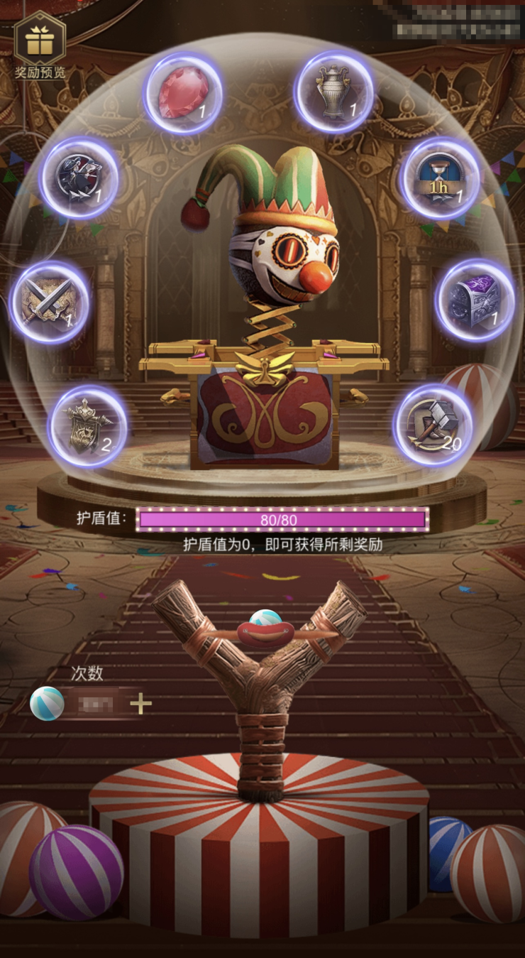活动期间,领主可消耗弹珠进攻小丑,打中小丑身边的道具立即获得该道具,打破小丑身上的保护罩,即可获得本轮剩余的奖励。