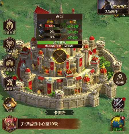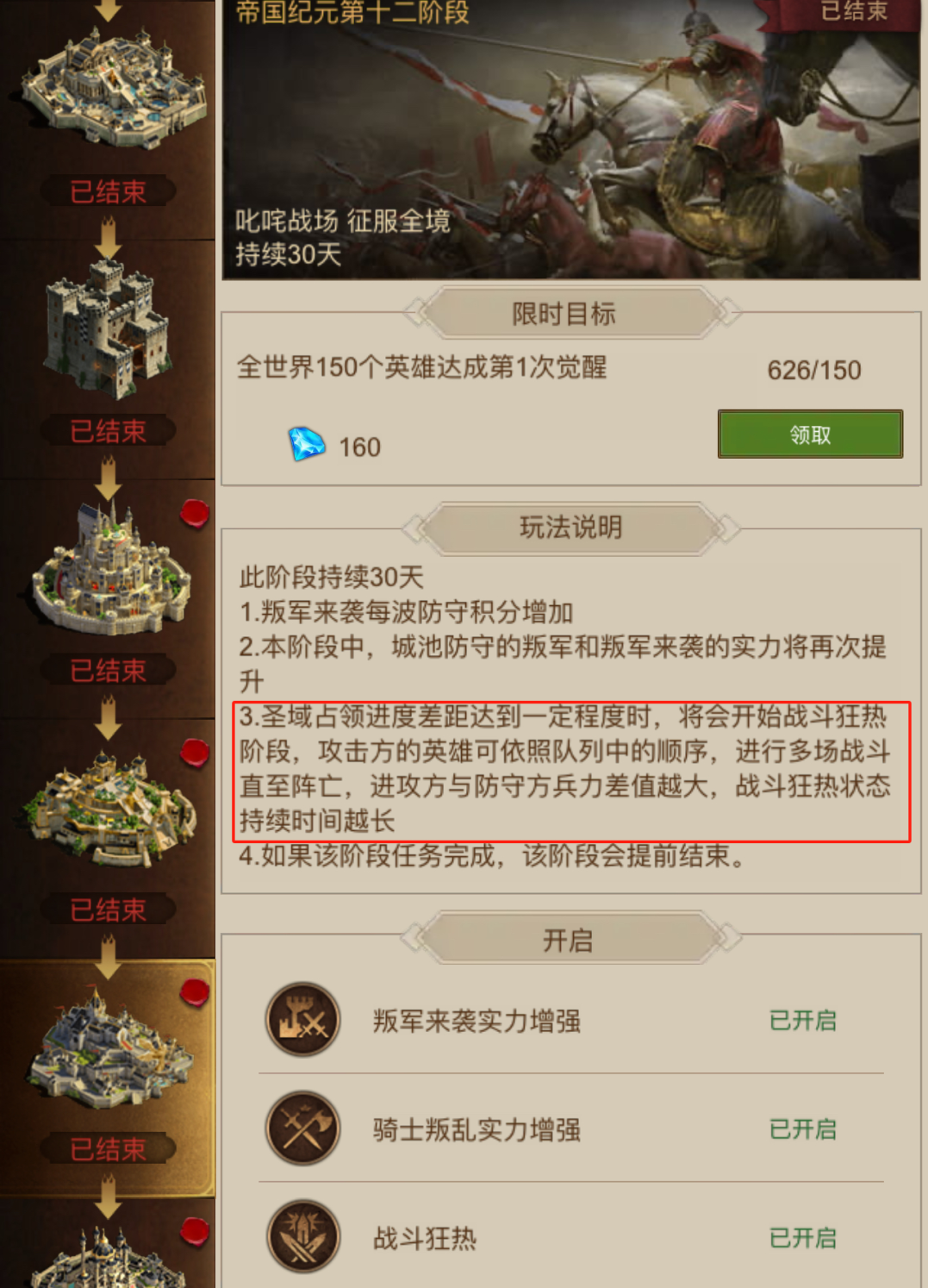 帝国纪元达到12阶段时,卡美洛占领进度达到一定差距会开启战斗狂热阶段。
