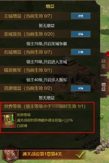 第二天或者更晚进服的玩家,在达到对应等级之前,攻打战役会获得一定比例的额外经验补偿,最高加成为+200%,可在主城点击增益界面查看当前经验加成情况,具体规则以游戏内公告为主。