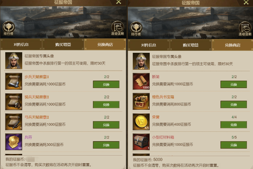 征服帝国活动中可使用征服币兑换断简、红材料箱、二觉天赋徽章等高价值道具。