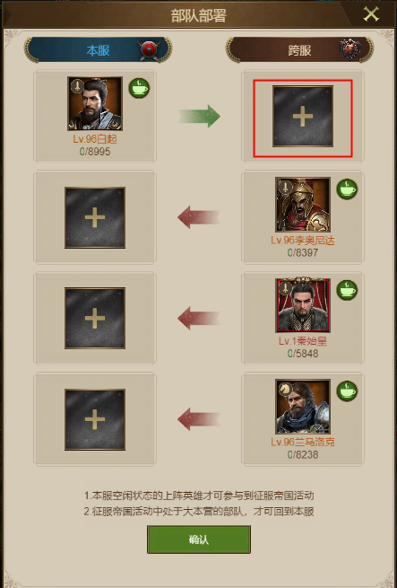 部署英雄。点击英雄部署,选择你要上阵的将,点击加号即可将英雄部署到征服帝国地图中,建议只选技能将和你最强力的将。未进行部署则无法出击。