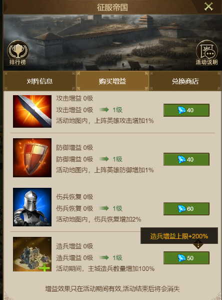 准备足够多的粮食,提前买好造兵增益,准备充足的兵力;活动开始前喂饱战兽,吃加速、攻防药水。