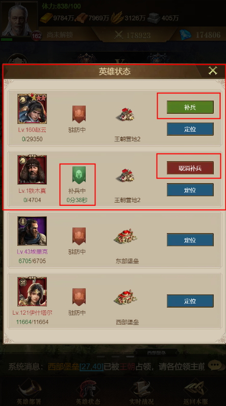 及时查看英雄状态和补兵。英雄及时补兵才能持续杀敌,点击英雄状态,就可以看到你的英雄当前是否需要补兵。在大本营的英雄,可消耗主城兵营部队直接进行补兵;非大本营的英雄,则需等待一段时间才可进行补兵。