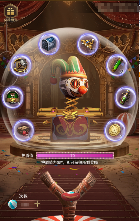 活动期间,领主可消耗弹珠进攻小丑,打中小丑身边的道具立即获得该道具,打破小丑身上的保护罩,即可获得本轮剩余的奖励。