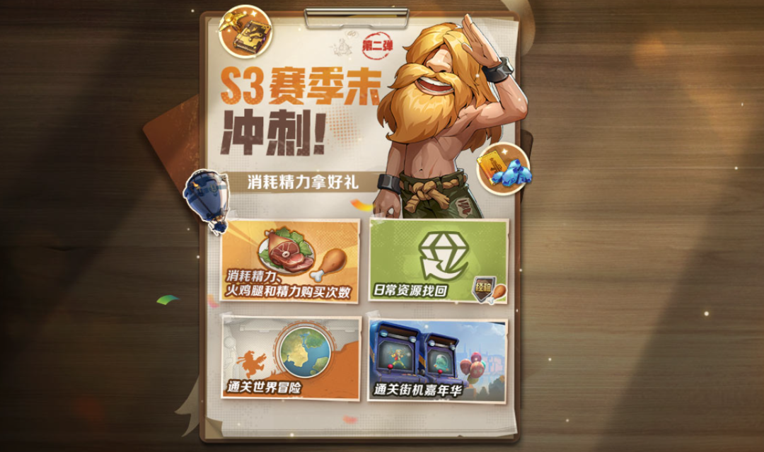 S3赛末将至,冲分不能停!赛季末体力将清空,指挥官们可以参与世界冒险、街机嘉年华、联合行动等消耗精力哦!达成累积消耗精力赢好礼,蓝宝石、合金镐头、究极便携军工卡、史诗武器碎片宝箱等奖励。
