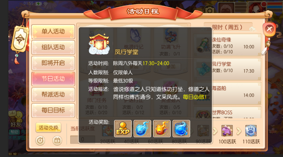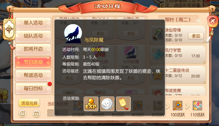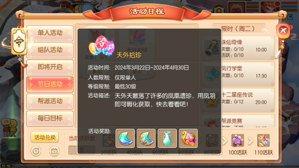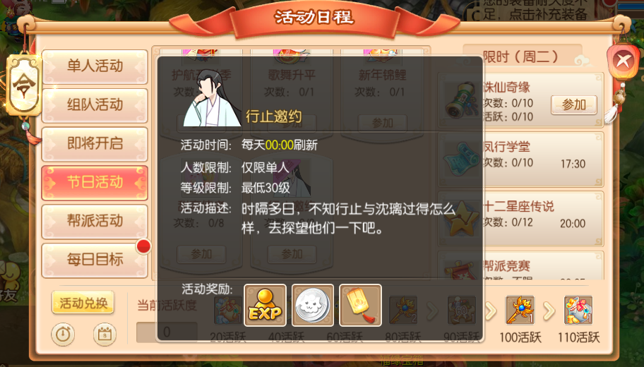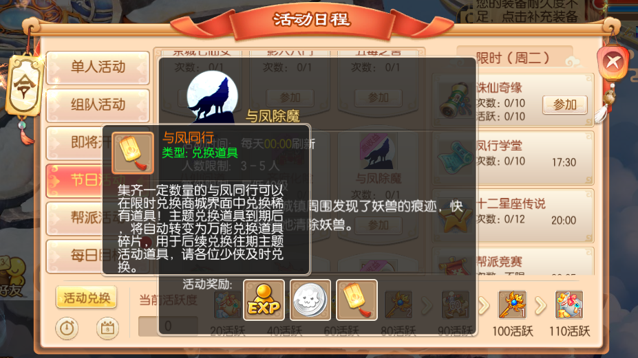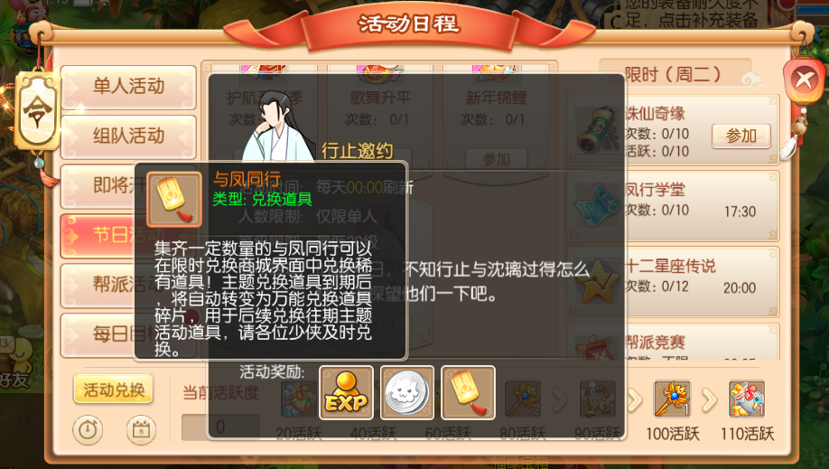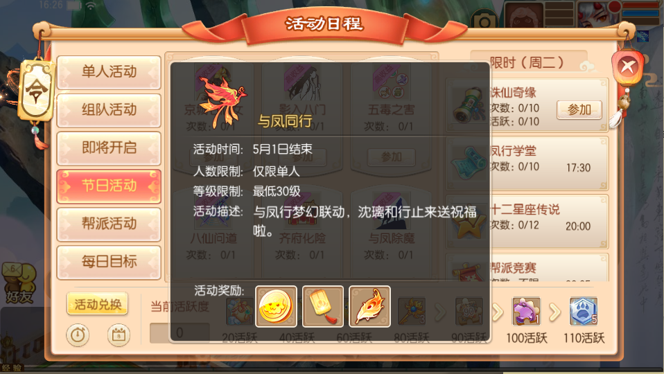 活动期间,等级在30级以上的少侠可以单人参加这项活动,本活动为月度单人活动,完成可以获得专属兑换道具“与凤同行”哦~