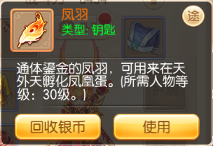 活动期间,仅限等级在30级以上的少侠单人参与活动,用于孵化凤凰蛋的道具【凤羽】可以从活动“与凤同行”中获取,每日可获得5枚。