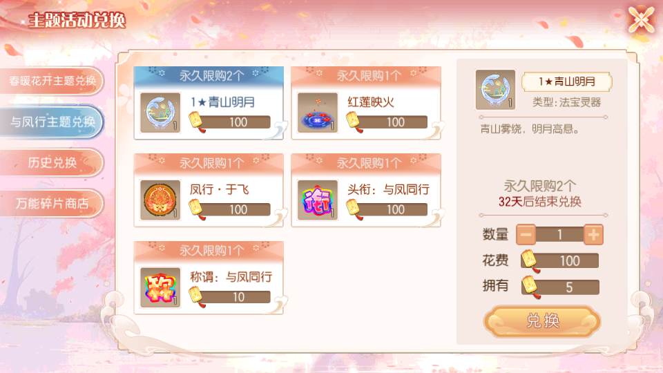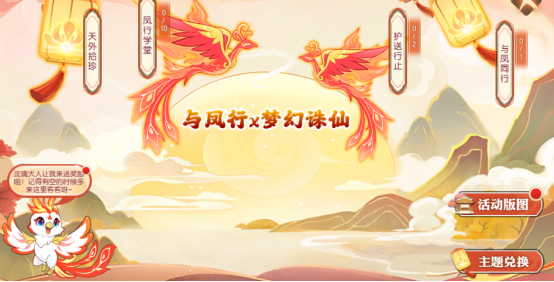 与凤行专属主题兑换商店已经开启,参与与凤行相关主题活动,就可以获得专属主题兑换道具【与凤同行】,各种法宝、法印和头衔、称谓,等待你的兑换哦!