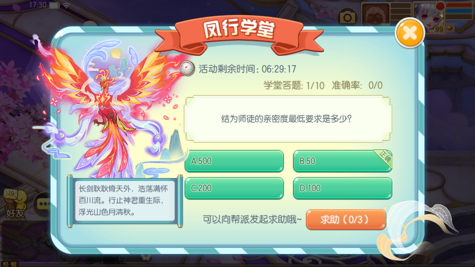 活动期间,等级在30级以上的少侠可以单人参与,在学堂进行答题挑战,可以获得丰厚奖励哦!