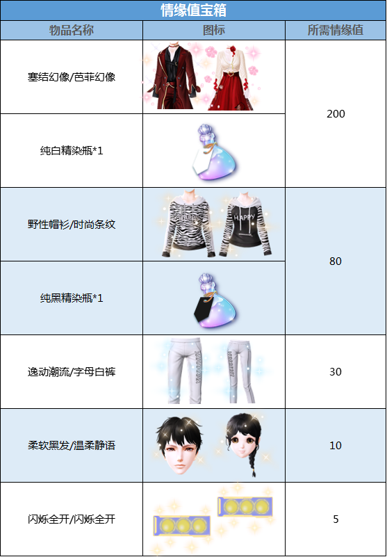 3、情缘值达到: 5、10、30、80、200,时,可获得情缘值宝箱奖励。除非卖服饰外,还有纯黑、纯白的精染瓶~