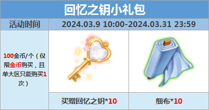 4、3.9 10:00 - 3.31 23:59 商城上架回忆之钥小礼包,只需100金币,就可以获得10细布,附赠10个回忆之钥。