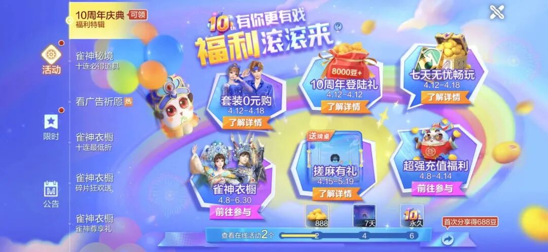 十周年限定礼来啦!4月12日当天,麻友们登录游戏即可在活动界面直接领取大额游戏豆,领取的游戏豆数量将与自己近半年的活跃天数有关,活跃天数越多,可以领取到的游戏豆数量越多,和好友们比比看谁拿到的豆子更多吧~