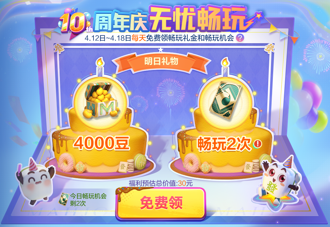 周年庆无忧畅玩活动将于4月12日正式开启,活动期间(4月12日至4月18日)麻友们每天都可以免费领取畅玩礼金和畅玩机会。