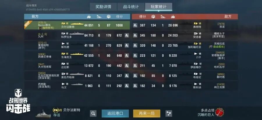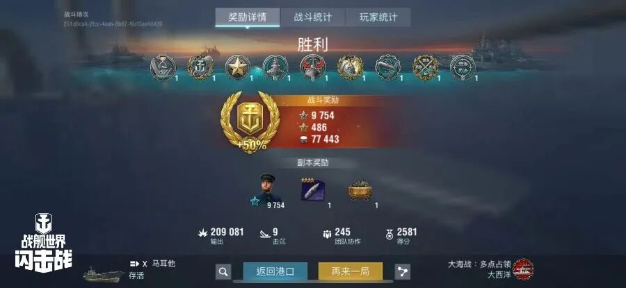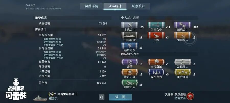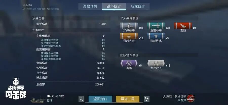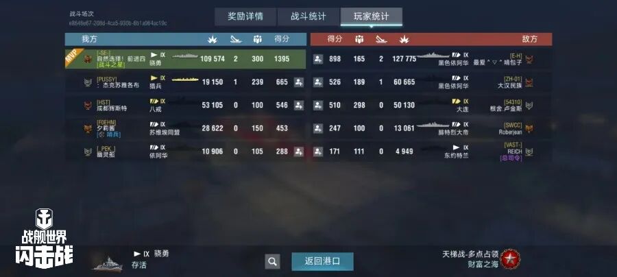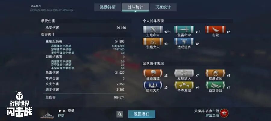 舰长@自然选择!前进四驾驶S系IX级驱逐舰骁勇鱼雷命中13发!主炮命中221发!击毁敌方战舰2艘,造成敌舰起火3次!总伤害达10w+!恭喜舰长获得本场排位胜利~