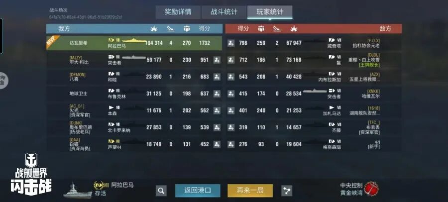 舰长@达瓦里希驾驶M系VIII级战列舰阿拉巴马,主炮命中58发!击中核心区5次!破坏部位3次!击毁敌方战舰4艘!总伤害10W+!恭喜舰长获得本局胜利!