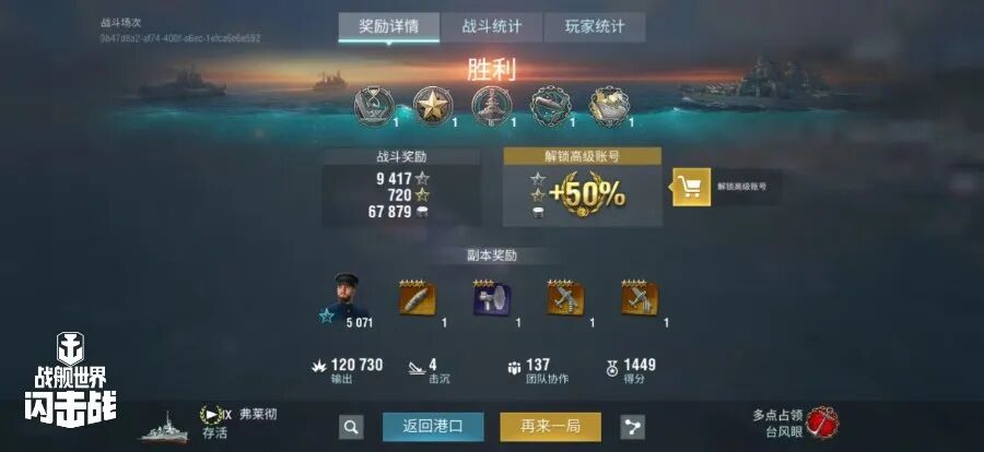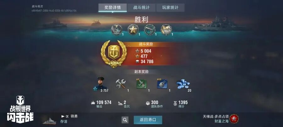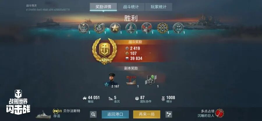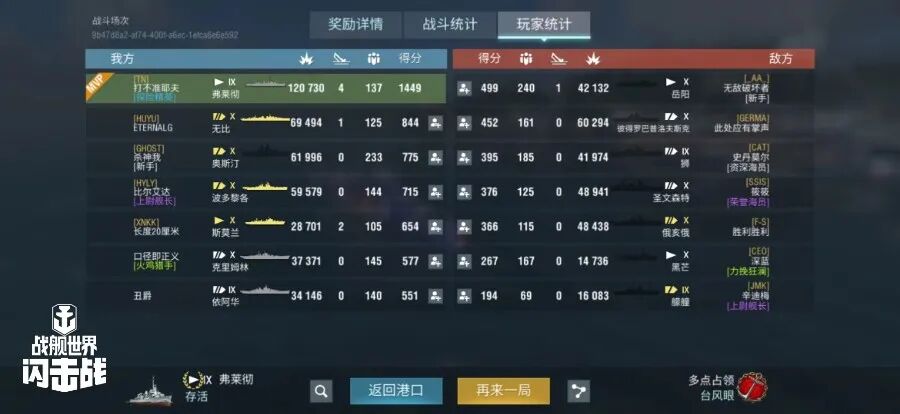 舰长@打不准耶夫驾驶M系IX级驱逐舰弗莱彻主炮命中150发!鱼雷命中18次!击毁敌方战舰4艘,造成敌舰进水3次!总伤害12w+!恭喜舰长获得战斗胜利~