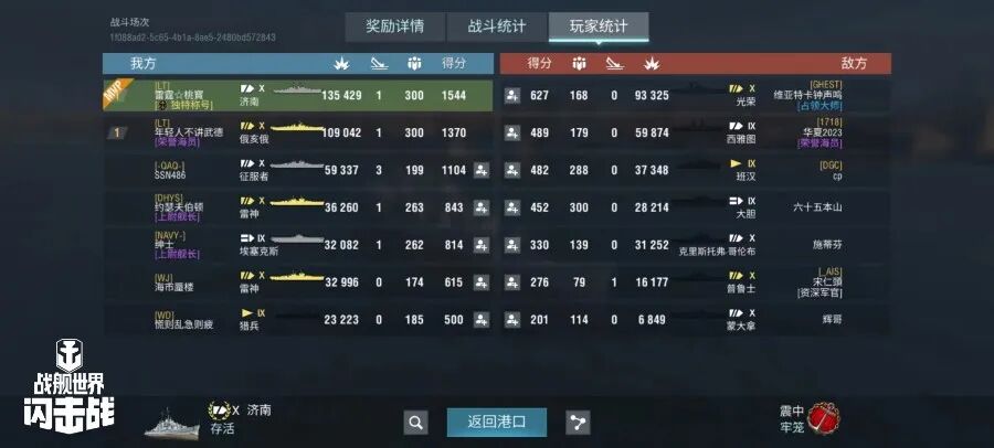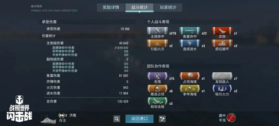 舰长@雷霆☆桃寳驾驶C系X级巡洋舰济南主炮命中219发!鱼类命中22发!击毁敌方战舰1艘,造成敌舰进水3次!总伤害13W+!恭喜舰长获得战斗胜利~