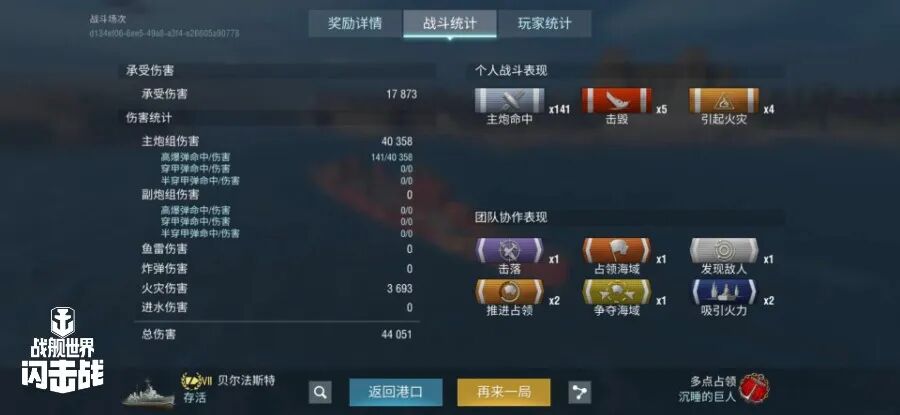 舰长@Marion舰长驾驶Y系VII级巡洋舰贝尔法斯特主炮命中141发!击毁敌方战舰5艘!造成敌舰火灾4次!总伤害4W+!恭喜舰长获得海怪来袭和众生平等史诗勋章~