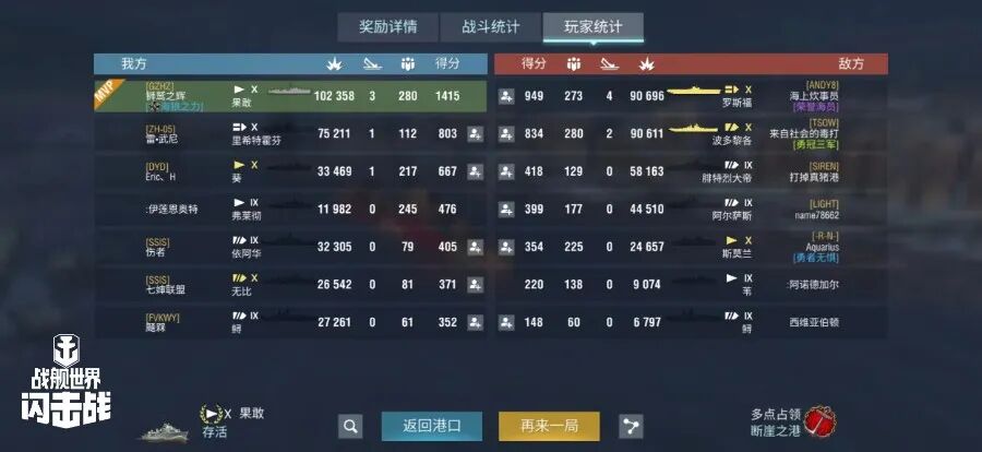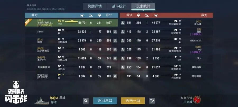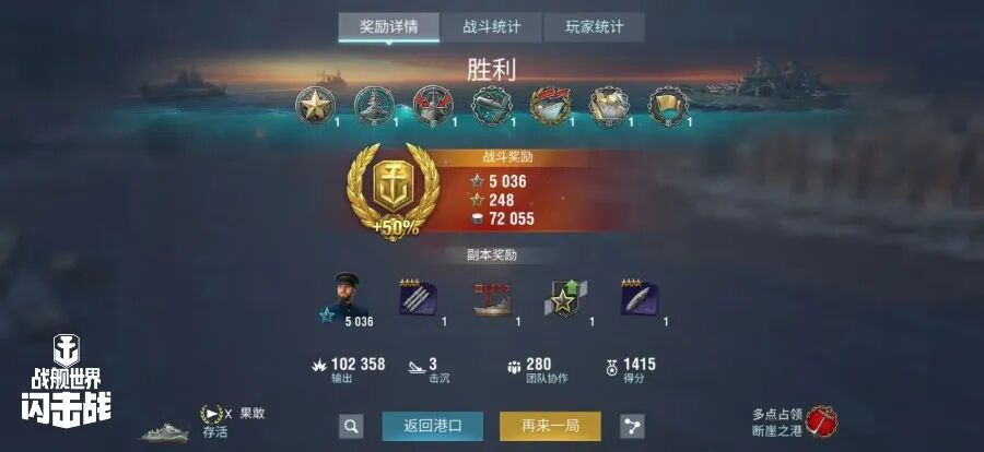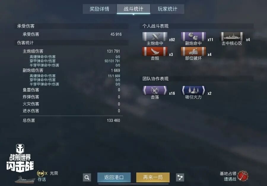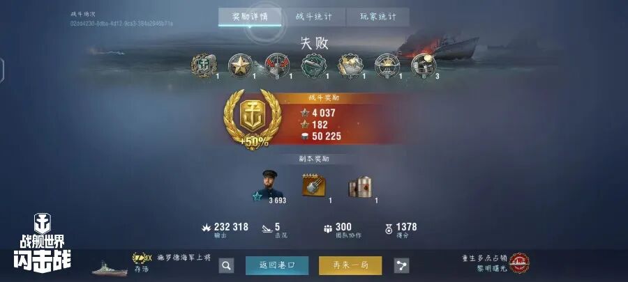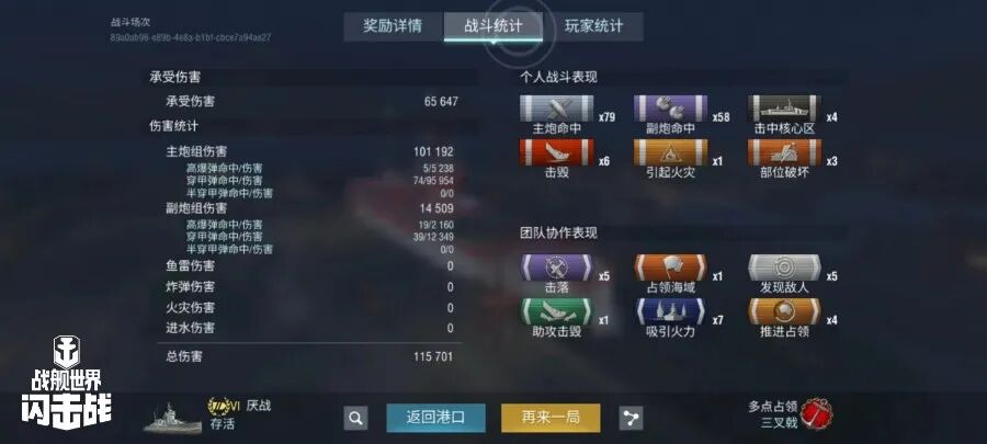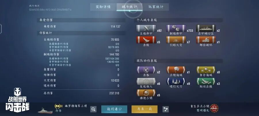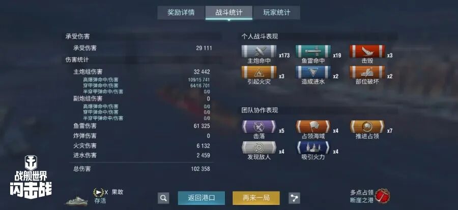 舰长@狮鹫之辉驾驶Y系X级驱逐舰果敢鱼雷命中19发!主炮命中173发!击毁敌方战舰3艘,造成敌舰起火3次!总伤害达10w+!恭喜舰长获得最后希望史诗勋章~