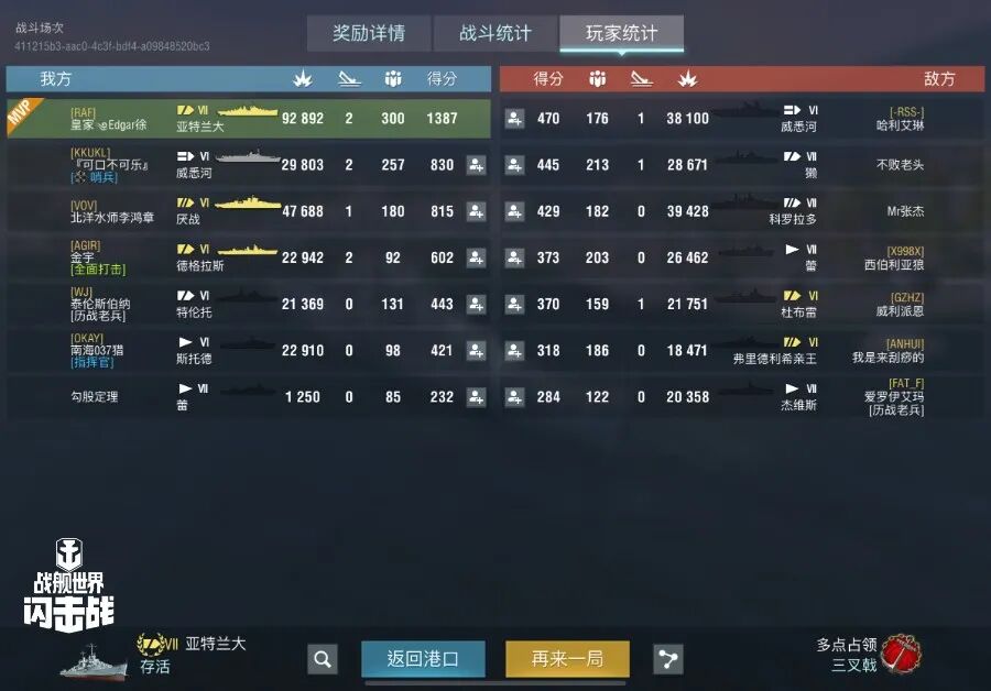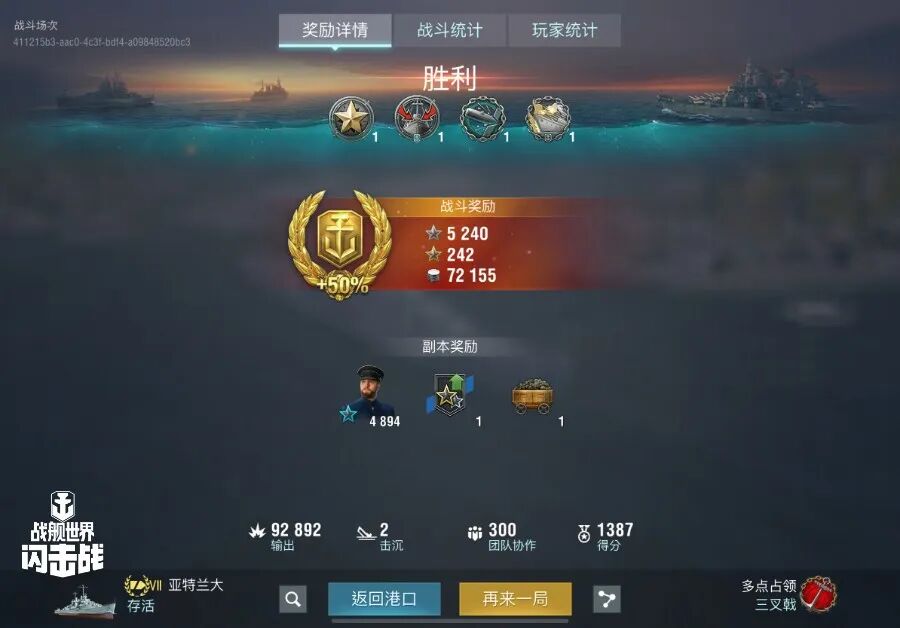 舰长@皇家Edgar徐驾驶M系VII级巡洋舰亚特兰大主炮命中312发!击毁敌方战舰2艘!造成敌舰火灾10次!总伤害9W+!恭喜舰长获得战斗胜利~