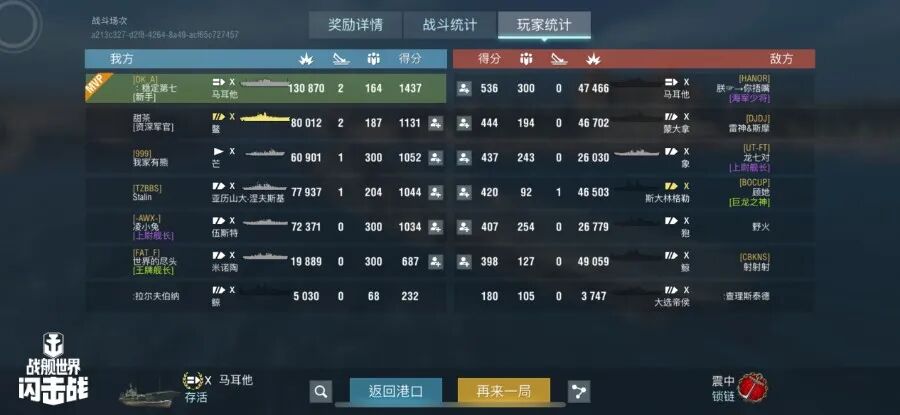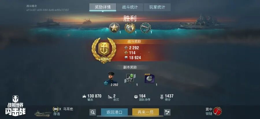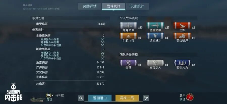舰长@:稳定第七驾驶Y系X级航母马耳他炸弹命中93发!鱼雷命中27发!引起敌舰火灾9次!击毁敌方战舰2艘!总伤害13w+!恭喜舰长获得水火无情史诗勋章~