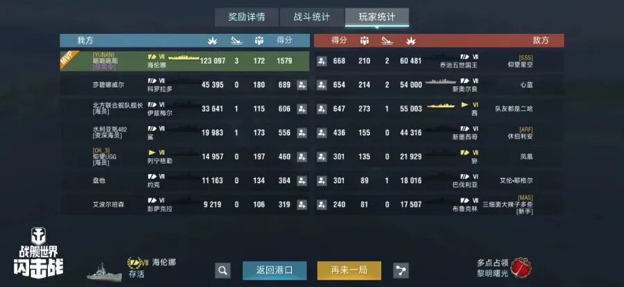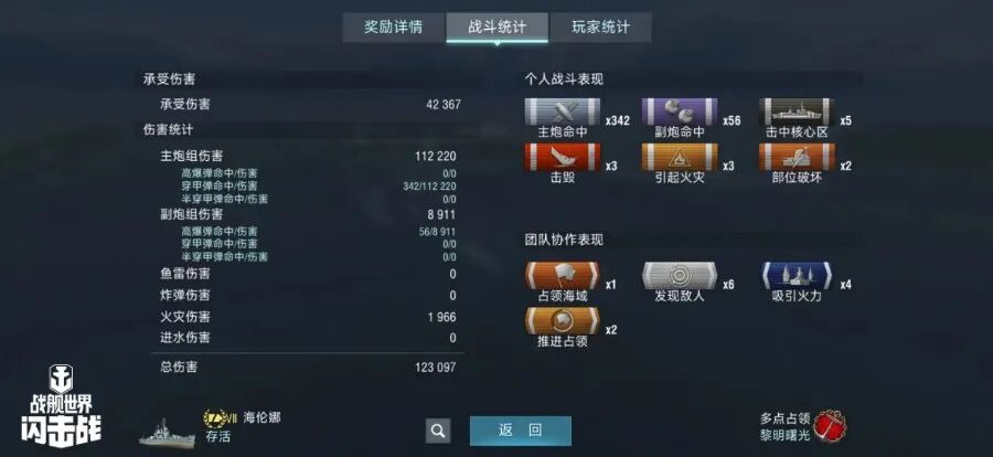 舰长@呃呃呃呃驾驶M系VII级巡洋舰海伦娜主炮命中342发!引起火灾3次!击毁敌方战舰3艘,总伤害12W+!恭喜舰长获得最后希望史诗勋章~